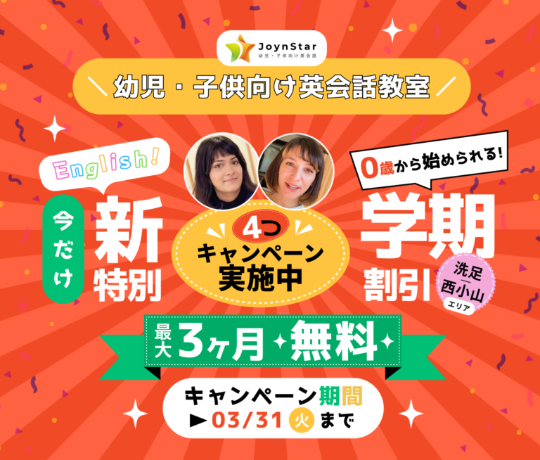 洗足駅・西小山駅から近くの幼児・子供向けの英会話スクールです。文法や会話を学ぶレギュラーコース、日常英会話に特化したスピーキングコース、フォニックスに特化したフォニックスコースから好きなコースを選べます。少人数レッスンが特徴です。幼児向けのプリスクールやファミリークラスも開催中!